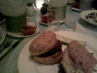 I went with the SCOES which is basically 1/4 Chicken cooked southern style and 2 waffles. A few others ordered this as well. Someone also ordered an omelet and RB went with some smothered chicken, grits and greens. I tasted all of it except the omelet. This place rules. I loved the chicken and thought it was exactly as I expected = BOMB, and the waffles were perfectly cooked. The tastes really do come together and you need to eat a piece of chicken with a bite of waffle dipped in some syrup. It is the truth, ain't just a gimmick.